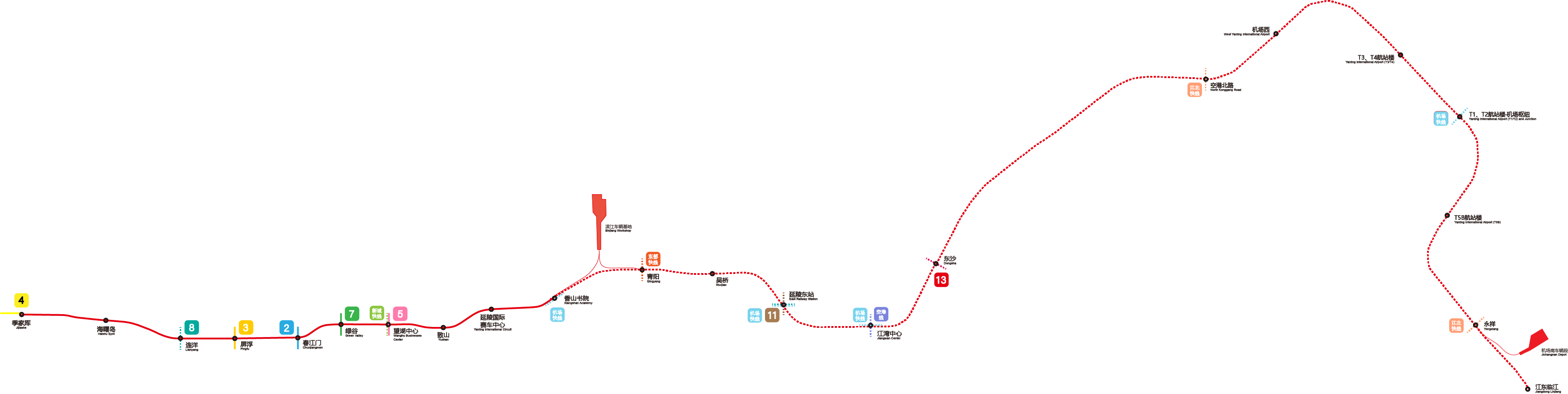 - 延陵地铁1号线三期工程(机场延伸线)全长15千米,共设车站8座;线路西起江湾新城站(不含),东至江东临江站,设计速度100千米/小时,车辆与一期工程一致,初期采用4节编组,近远期采用4、6节编组混跑运营,新建机场南车辆段。计划随延陵江东国际机场同步实施。